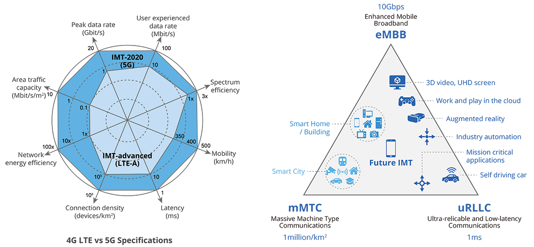 5G - the next generation of mobile telecommunications technology, is on the horizon and promises to deliver a myriad of new services and capabilities such as Enhanced Mobile Broadband (eMBB), Ultra Reliable Low-Latency Communications (URLLC) and Massive Machine-Type Communications (mMTC). A new band of the radio frequency spectrum between 30 – 300GHz has been opened for use, and a new telecommunications standard for 5G has been defined encompassing network speed, latency, the number of devices that can be connected, QoS and other conditions.