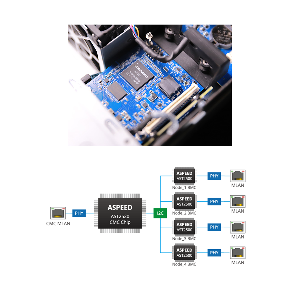 GIGABYTE’s High Density systems include a CMC (Central Management Controller) chip and port as standard, allowing you to monitor and manage all four server nodes within the chassis with a single management LAN connection. This helps reduce the number of management LAN cables / switch port use, as well as allowing the user to manage the whole cluster from a single interface