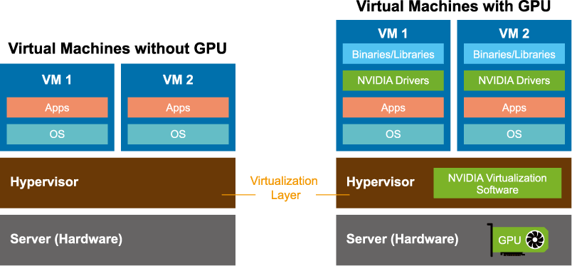 To create a virtual GPU, software such as NVIDIA Virtual GPU Manager installs in the hypervisor. This software coupled with other NVIDIA software (vCS, vDWS, vPC, or vApps) allows customization of the virtual machine. On this vGPU layer are the VMs as before, but now with NVIDIA drivers and binaries/libraries.