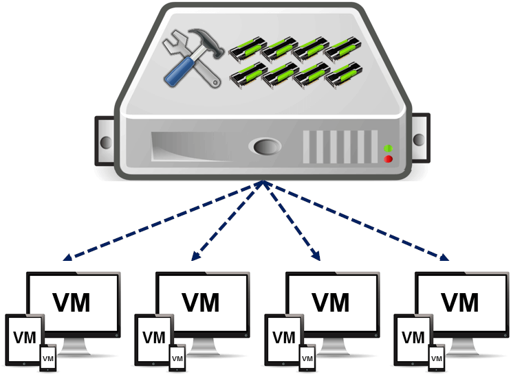 To start, a server is built with typical hardware (CPU, RAM, storage, GPU, network interconnects, etc.) that has been determined for the end users. After hardware installation, a hypervisor (Microsoft Hyper-V, Citrix XenServer, etc.) is installed to abstract the hardware. This hypervisor creates a virtualization layer upon which the VMs are built. The hypervisor that is between the VMs and the hardware contains a Virtual Machine Manager. Through this technology each VM is added with their own operating system and applications. At this point a server has virtualized all but the GPU.